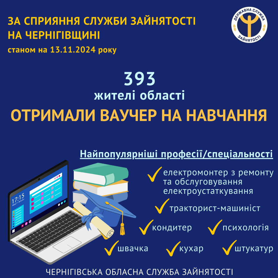 З початку року 393 жителі Чернігівщини отримали ваучер на навчання від служби зайнятості та можливість безкоштовно опанувати нову професію (спеціальність) або підвищити кваліфікацію.