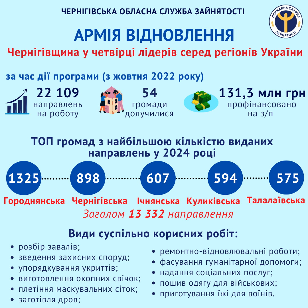 Серед громад області, які долучилися до суспільно корисних робіт, найактивнішими є Городнянська, Чернігівська, Ічнянська Куликівська та Талалаївська (Прилуцький р-н).