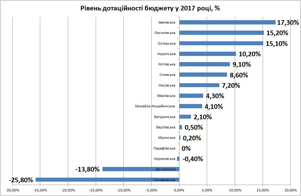 Три громади Чернігівщини за фінансовими результатами 2017 року повертають гроші до державного бюджету (так звана «реверсна» дотація). Це Гончарівська, Деснянська та Корюківська. До речі, Гончарівська за цим показником (-25,8%) у 2017 році займає перше місце серед громад України, а Деснянська (-13,8%) посідає шосте місце у всеукраїнському рейтингу.
