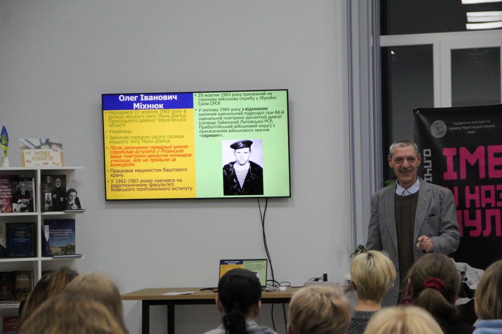 У Чернігівській центральній міській бібліотеці імені М.М. Коцюбинського дві зустрічі в рамках проєкту «Імена у назвах вулиць» були присвячені Герою Небесної Сотні та Захисникам України в сучасній російсько-української війні. Їх проведено у співпраці з регіональним представником Українського інституту національної пам’яті Сергієм Бутком.