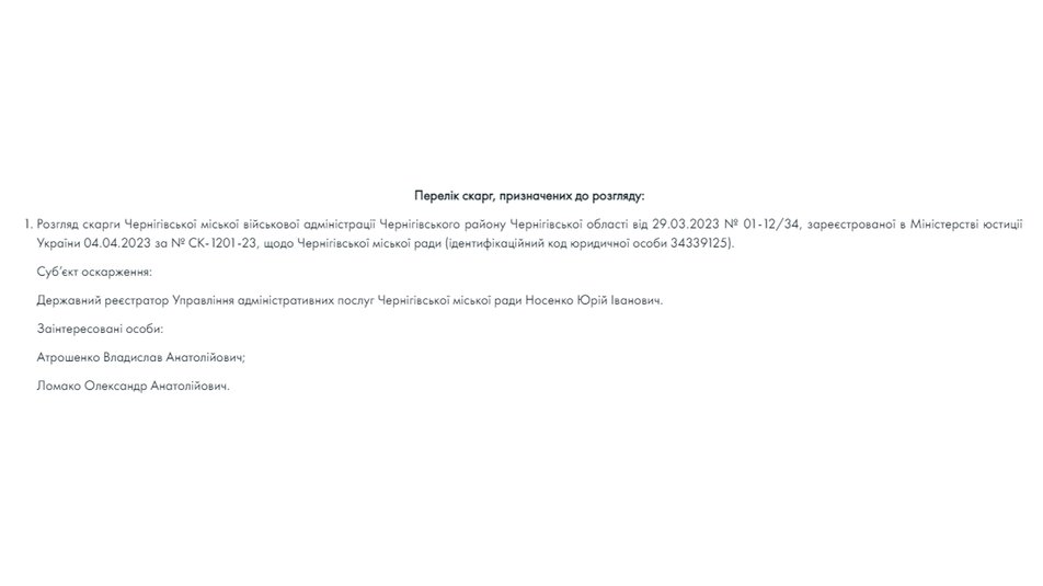 Суб’єктом оскарження є державний реєстратор управління адміністративних послуг Чернігівської міської ради Юрій Носенко. Олександр Ломако та Владислав Атрошенко вказані як заінтересовані особи.