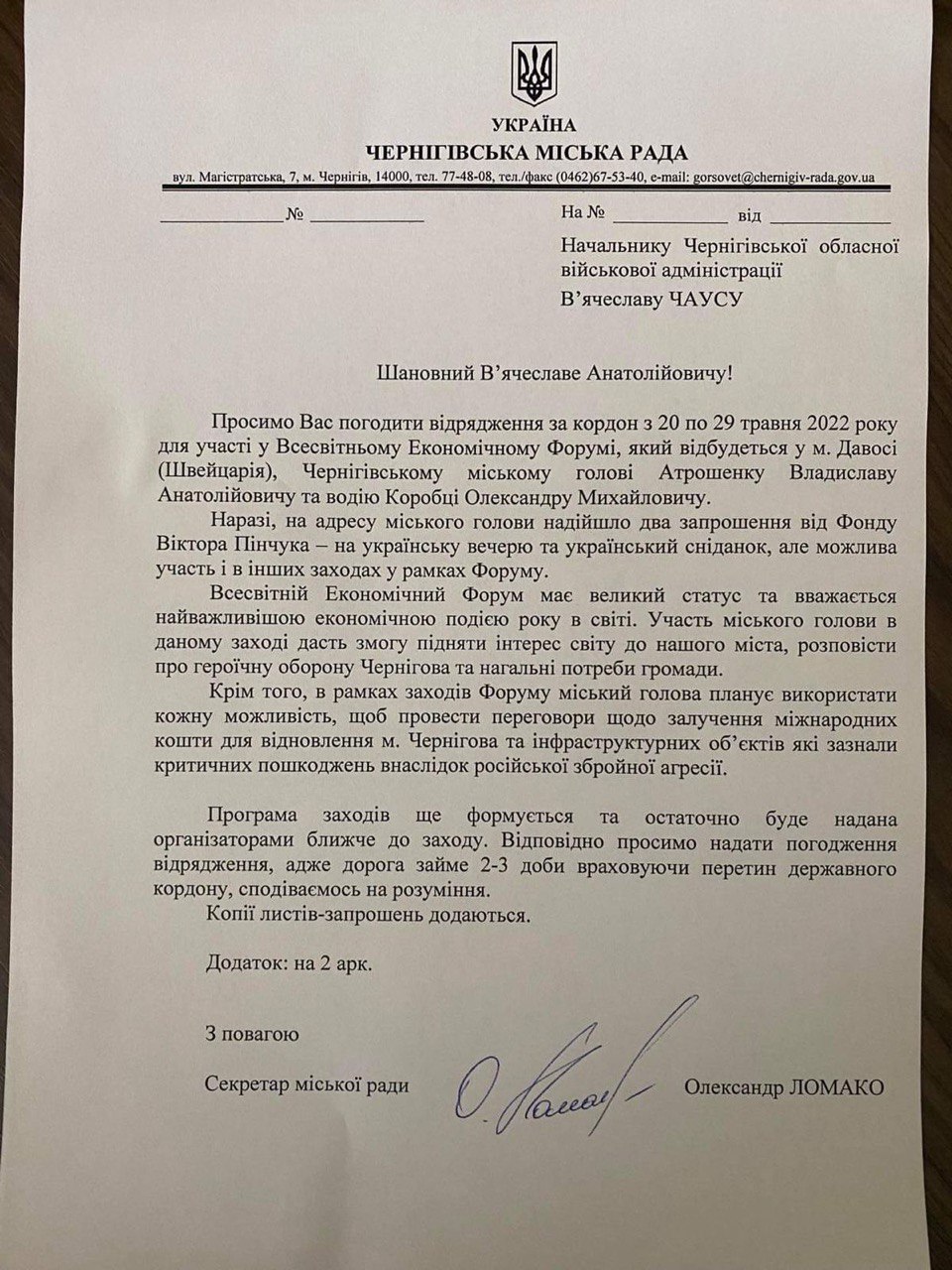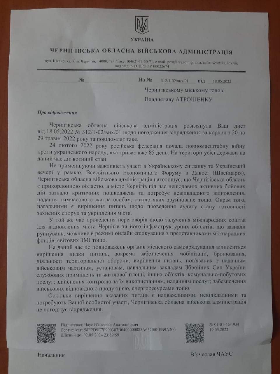 Згодом мер Чернігова таки вирушив у Давос, адже виявилося, що начальник ОВА не має повноважень забороняти виїзд чинному міському голові. Всі погодження щодо перетину кордону Атрошенко отримав у військового комісара області. 31 травня Владислав Атрошенко дав пресконференцію за результатами поїздки, що тривала з 20 до 29 травня на запрошення фонду Віктора Пінчука для залучення міжнародних коштів на відбудову міста.