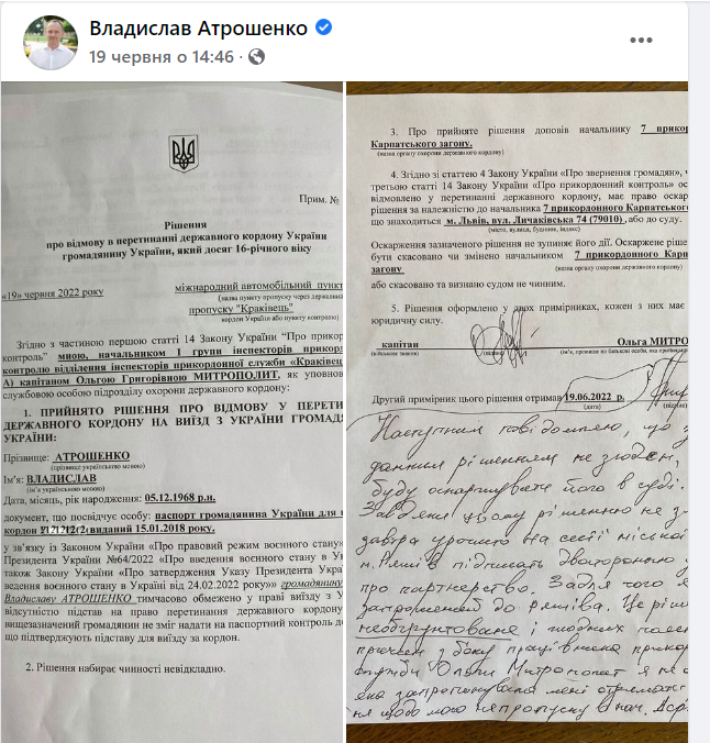 Скріншот із фейсбук-сторінки Владислава Атрошенка