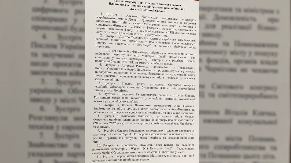 Міський голова відзвітував, що під час форуму домовився з міністром енергетики Швеції про пошук інвесторів для будівництва ТЕЦ і сміттєпереробного заводу. Із послом України у Швейцарії Атрошенко говорив про інвесторів, благодійників та органи влади, які допоможуть у відбудові. На зворотному шляху Атрошенко побував у польських містах Познань та Жешув, а також у німецькому місті-побратимі Чернігова Меммінгені. Із Жешувом Чернігів уже підписав договір про співпрацю, а про договір із Познанем поки інформації немає.
