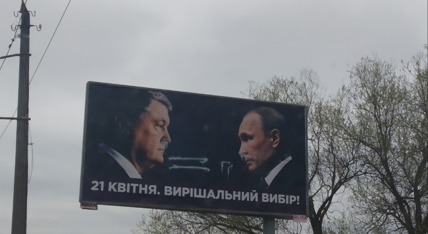 На білборді, замовником якого вказано Петра Порошенка, поставлено знак рівності між його зображенням та профілем Володимира Путіна, який також пошкоджений фарбою.