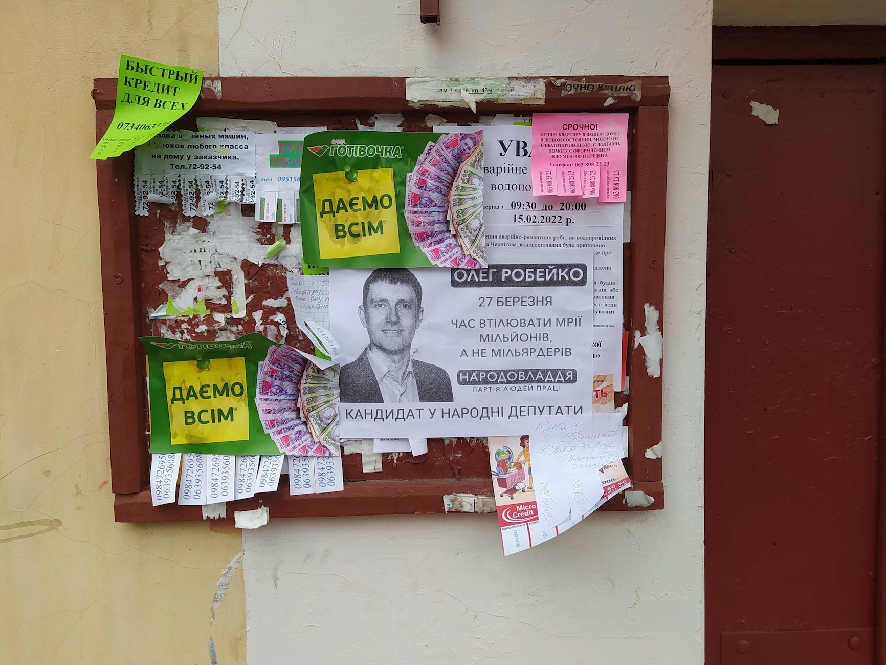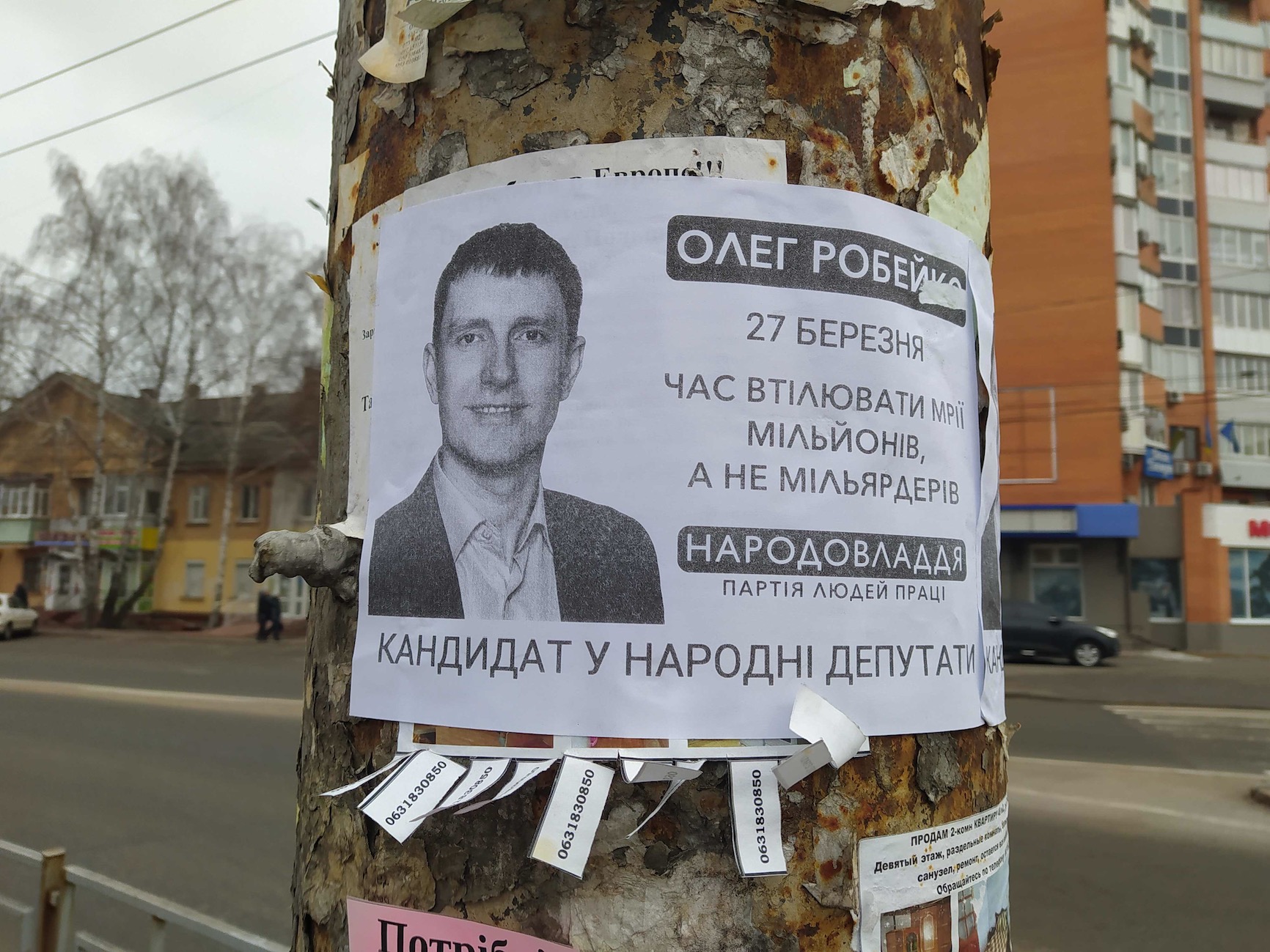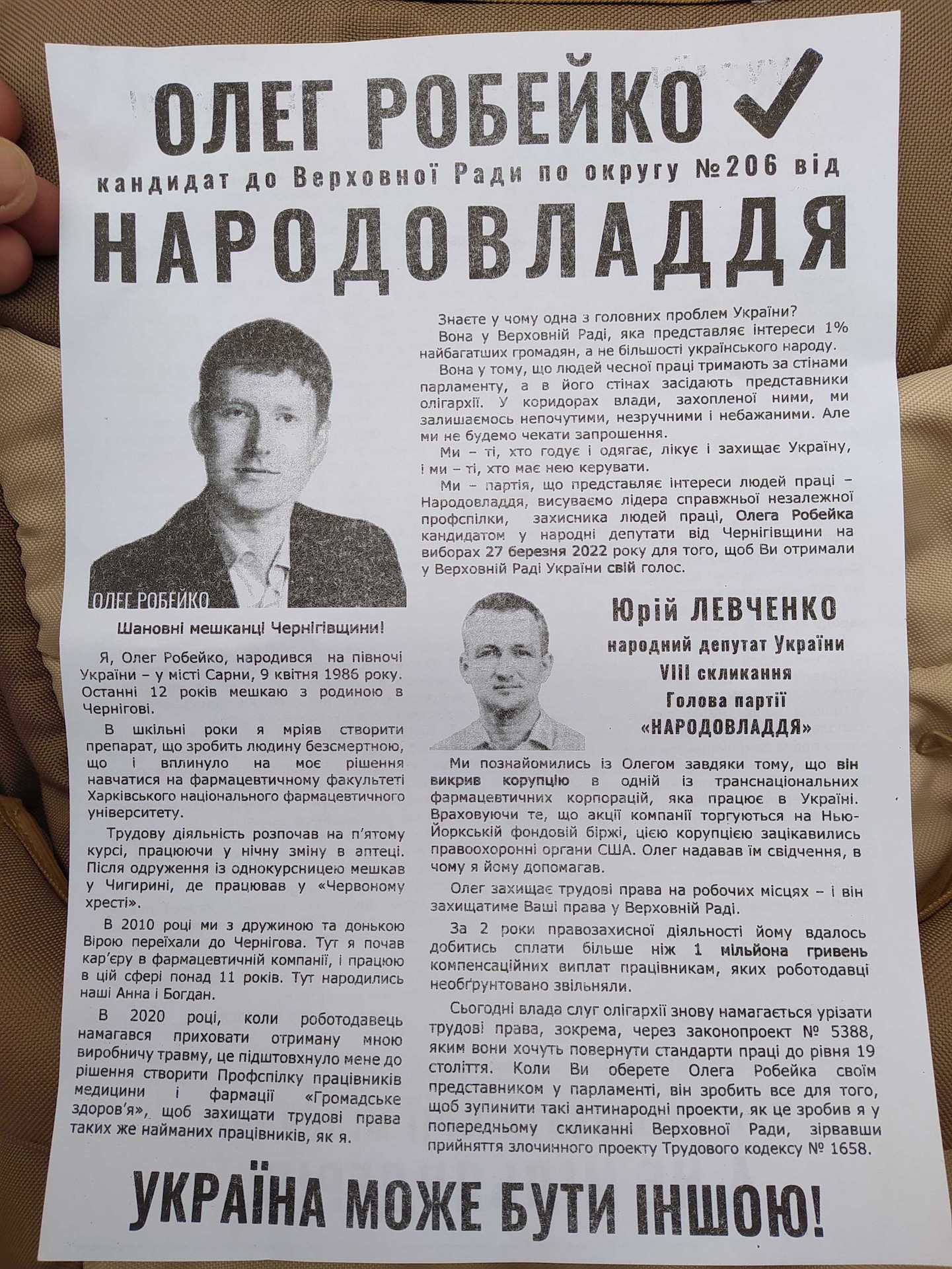 17 лютого 2022 року у Чернігові спостерігачі ОПОРИ також зафіксували розміщення друкованих агітаційних матеріалів на користь кандидата у народні депутати від політичної партії «Народовладдя» Олега Робейка на опорах електромереж, спеціально обладнаних дошках оголошень для розміщення агітматеріалів, а також на дошках оголошень біля під’їздів житлових будинків по вул. Жабинського, вул. Івана Мазепи та на проспекті Перемоги.