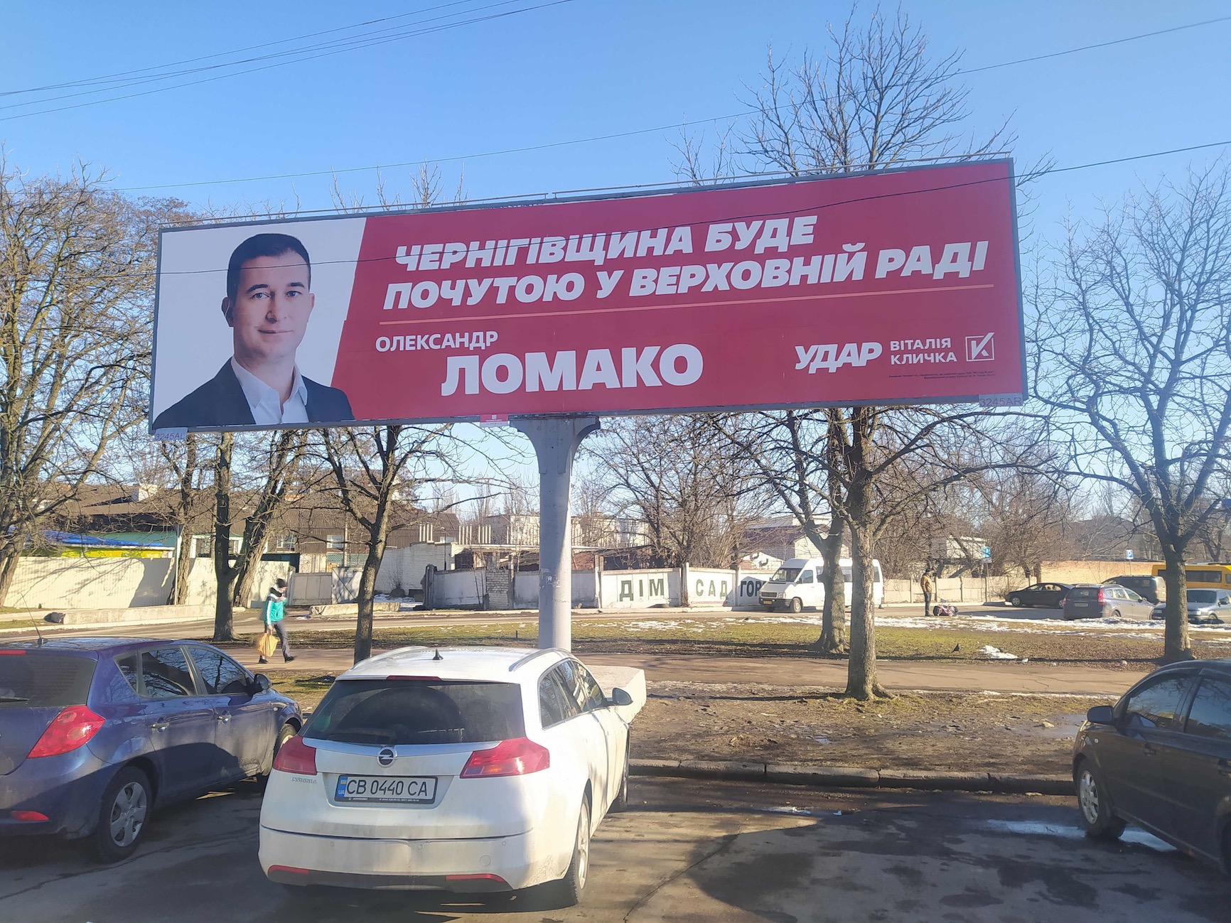 14 лютого 2022 року у Чернігові поблизу залізничного вокзалу представники Громадянської мережі ОПОРА зафіксували білборд із зображенням кандидата у народні депутати Олександра Ломаки («УДАР Віталія Кличка»). Друкований матеріал на носії зовнішньої реклами виконаний в червоно-білих кольорах партії, містив логотип партії та надпис «Чернігівщина буде почута у Верховній Раді! Олександр Ломако».