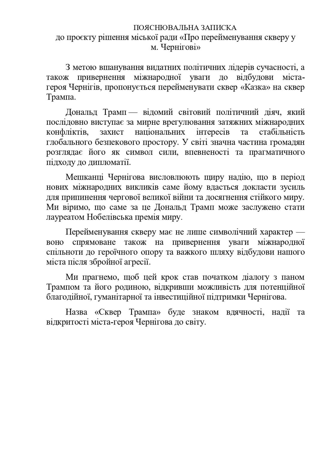 Ми прагнемо, щоб цей крок став початком діалогу з паном Трампом та його родиною, відкривши можливості для потенційної благодійної, гуманітарної та інвестиційної підтримки. Назва Сквер Трампа буде знаком вдячності, надії та відкритості міста-героя Чернігова до світу».