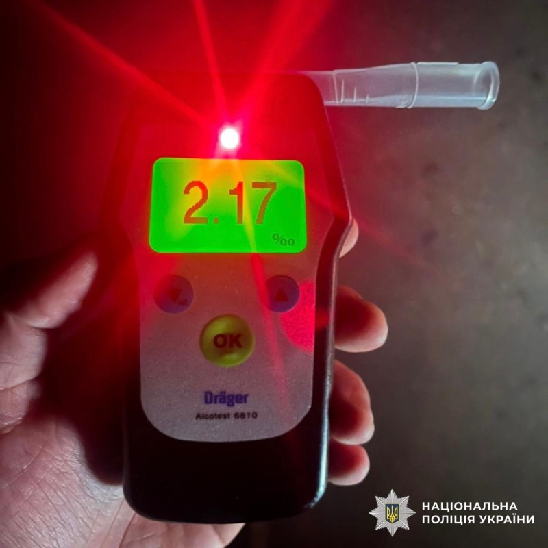 За кермом перебував 36-річний чоловік із явними ознаками алкогольного спʼяніння. Чоловік погодився пройти тест на визначення рівня алкоголю в крові за допомогою приладу «Драгер». Результат - 2,17 проміле, що майже в 11 разів перевищує допустиму норму.