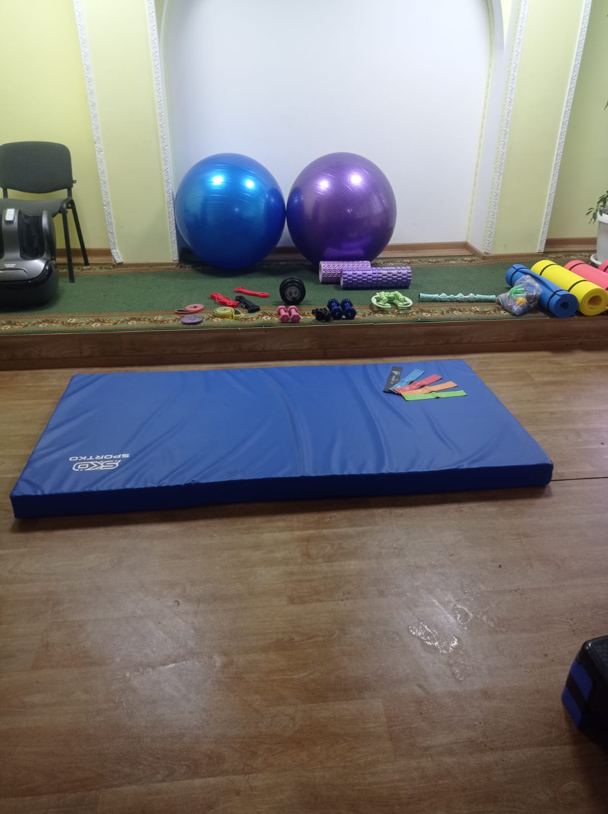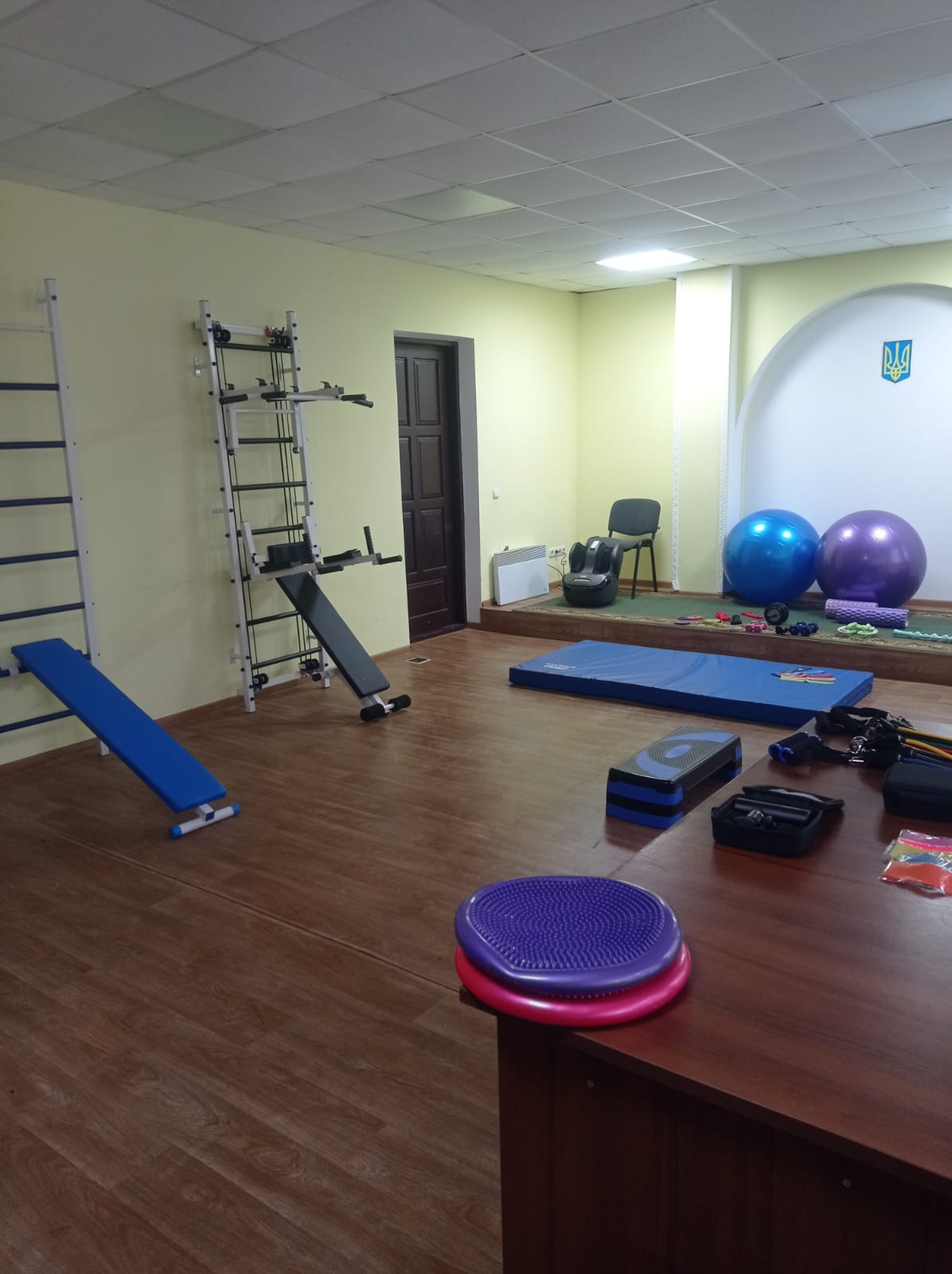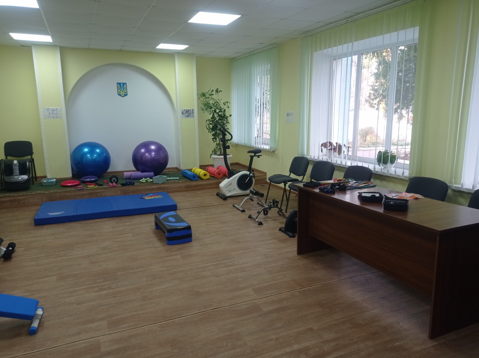 Зала оснащена необхідними тренажерами та реабілітаційним обладнанням для проведення занять з відновлення рухових функцій, зміцнення здоров’я, фізичного розвитку тощо.