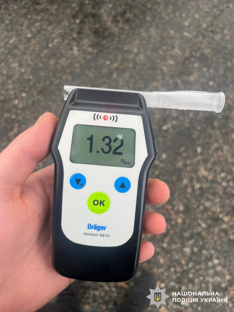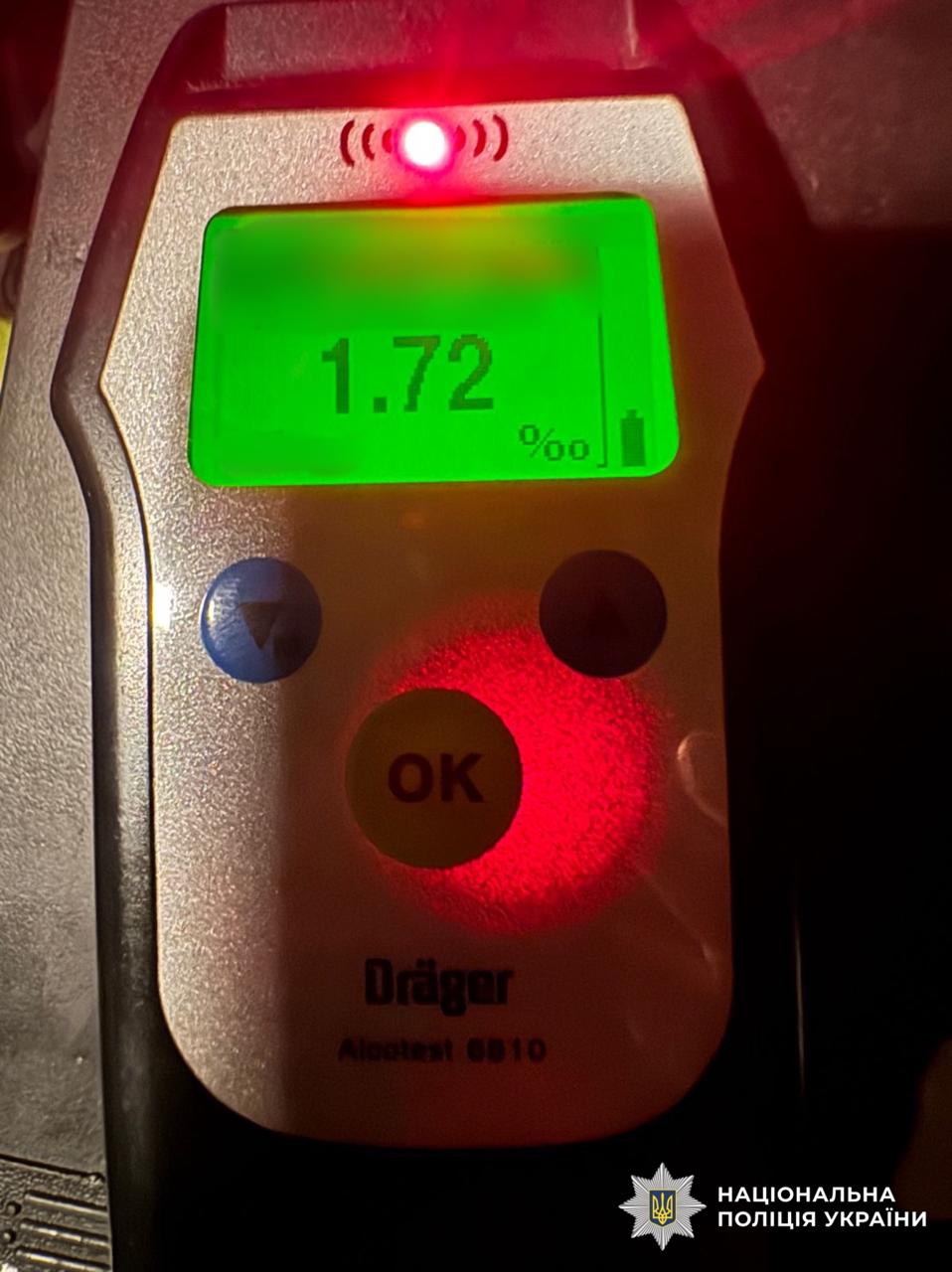 На пропозицію пройти тест за допомогою приладу «Драгер» водій погодився. Результат - 1,72 проміле, що майже у дев’ять разів перевищує допустиму норму (0,2 проміле).