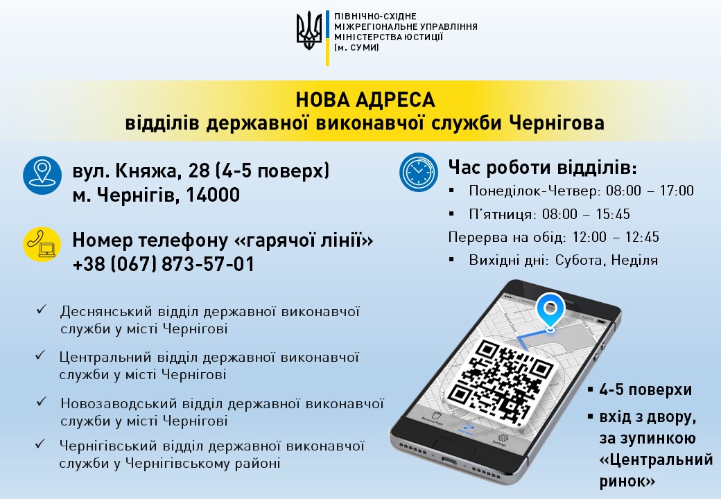 Нове місцезнаходження відділів державної виконавчої служби міста Чернігова