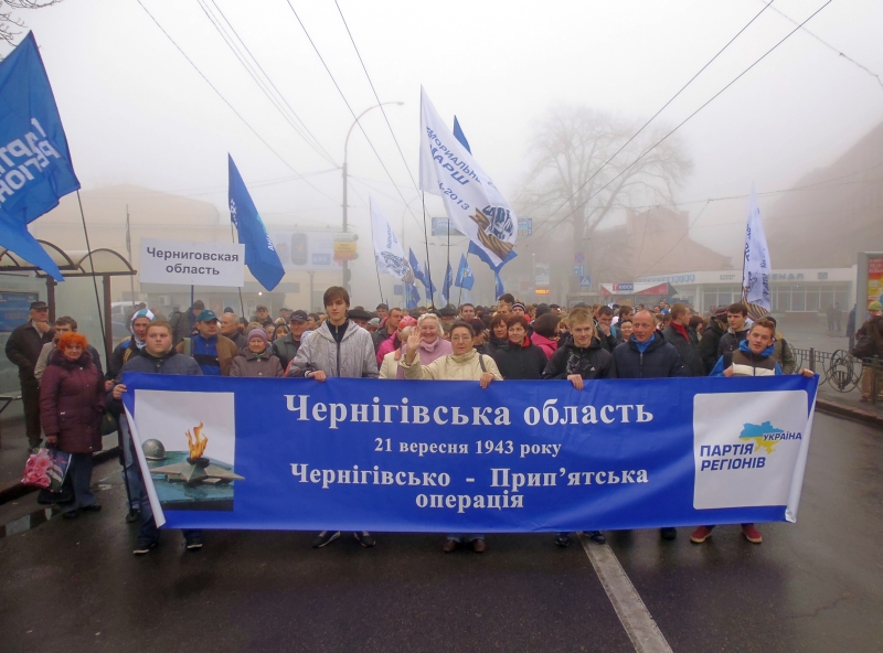 Учасники маршу несли у руках державні прапори, прапори Партії регіонів, таблички з назвами і датами населених пунктів, які в 1943-44 роках звільнила Червона Армія, а також транспаранти з гаслами “Я пам’ятаю! Я пишаюся!”, “Честь і слава ветеранам!”, “Не дамо переписати історію!”, “Фашизм не пройде! У Європу – без фашистів!”.