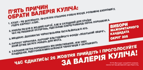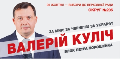 – 26 жовтня я закликаю всіх прийти на вибори та проголосувати. Важливо підтримати команду президента – за партійними списками це «Блок Петра Порошенка», а в одномандатному окрузі №205 – мене, Валерія Куліча, як єдиного кандидата від команди президента. Українці багато разів втрачали свою державність через те, що були роз’єднанні. Зараз ми маємо об’єднатися навколо одного лідера, щоб не повторити помилки історії. Петро Порошенко – легітимно обраний президент, він переміг у першому турі. Які у нас ще є варіанти, крім підтримати його та, закасавши рукави, працювати заради миру, економіки та розвитку нашої країни? Боюся, якщо ми втратимо цей шанс, наслідки спрогнозувати буде дуже важко.