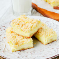 - Олією змащуємо бортики і дно ємності, в якій плануємо випікати ласощі. Висипаємо в цю форму 2/3 штрейзеля. Розрівнюємо крихту, трохи притискаючи і формуючи бортики. Виливаємо на штрейзель сирну начинку. Посипаємо десерт крихтою, що залишилася, розрівнюємо її та одразу ставимо страву в духовку. «Королівська ватрушка» буде готова за 40–50 хвилин.