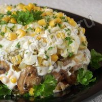 Состав: куриный окорочок – 1-2 шт, шампиньоны – 150 г, лук репчатый – 1 шт, морковь – 1 шт, маринованные огурцы (корнишоны) – 2-3 шт, кукуруза – 4-5 столовых ложек, яйца – 2 шт, майонез, зелень петрушки, укропа, чеснок – 1-2 зубчика, растительное масло для жарки, соль, перец