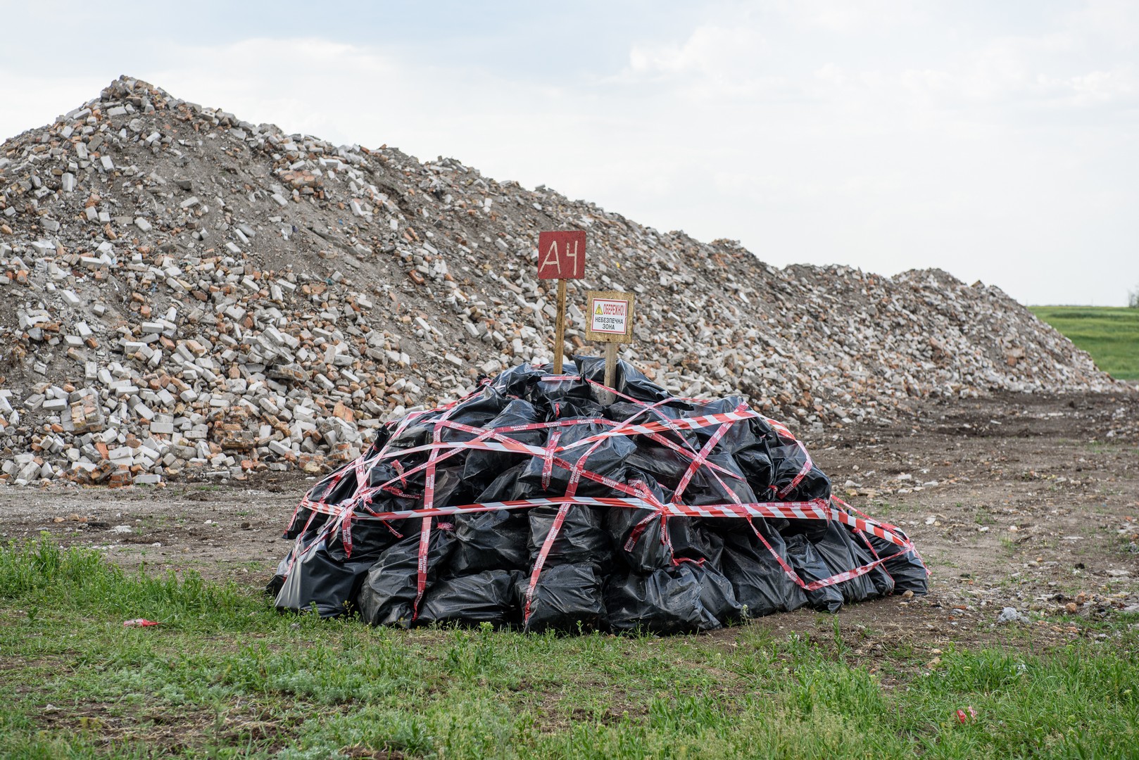 Місце тимчасового зберігання азбестовмісних матеріалів, зібраних під час розчищення завалів на Миколаївщині, квітень 2025 року, фото Дмитра Сазонова